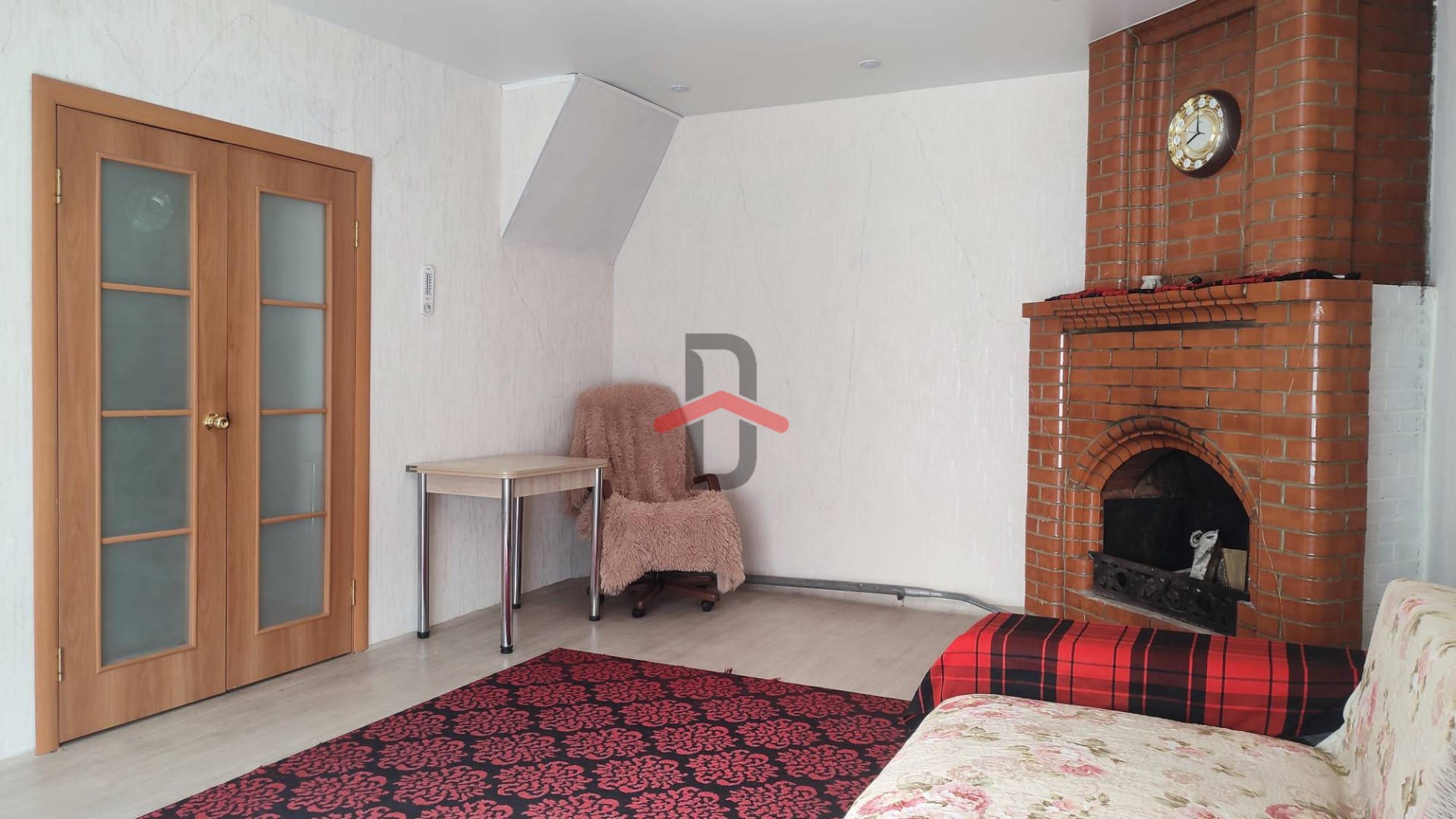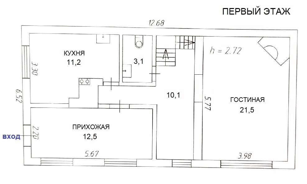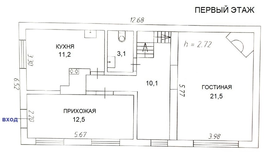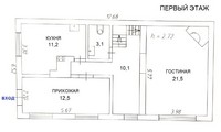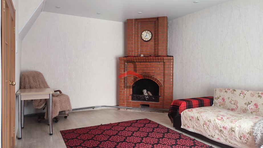 На первом этаже находится гостиная (21,5кв.м.) с настоящим камином из кирпича, кухня, большая прихожая и сан.узел.