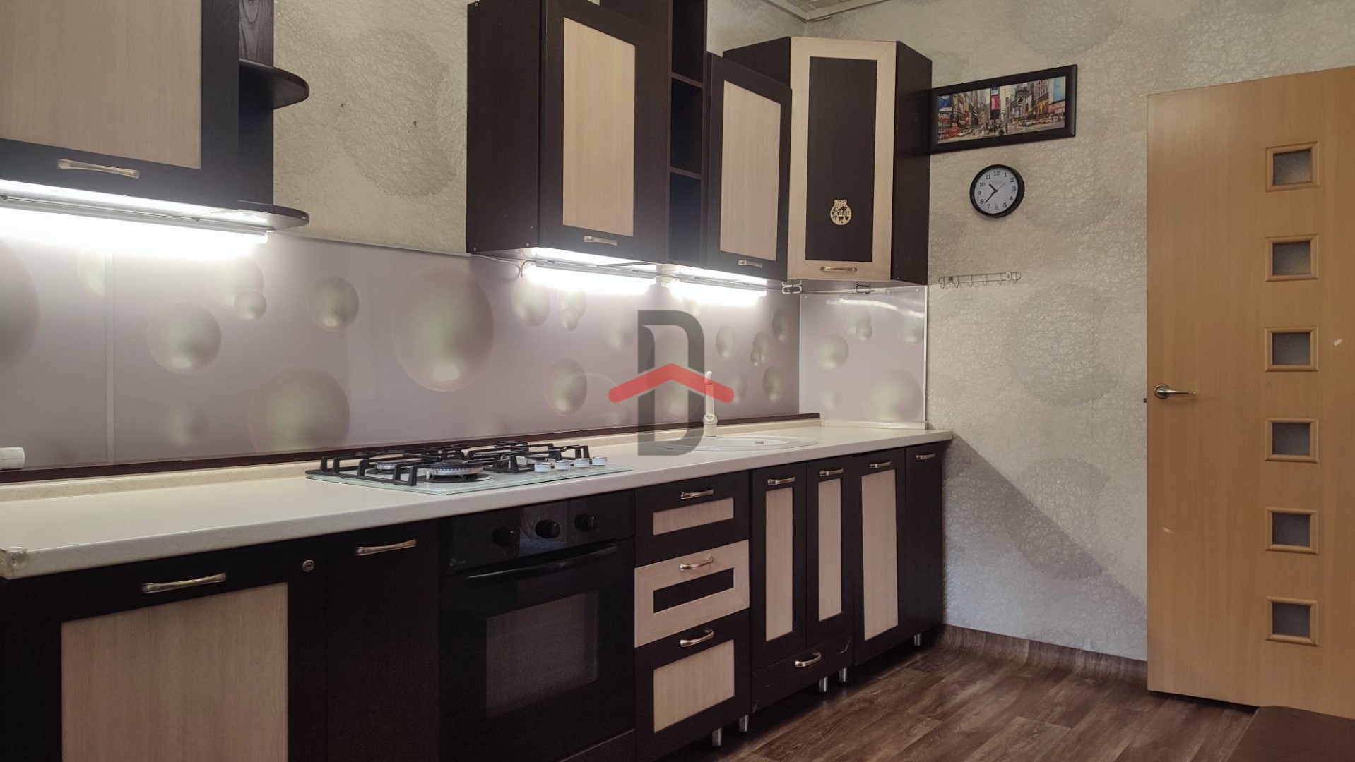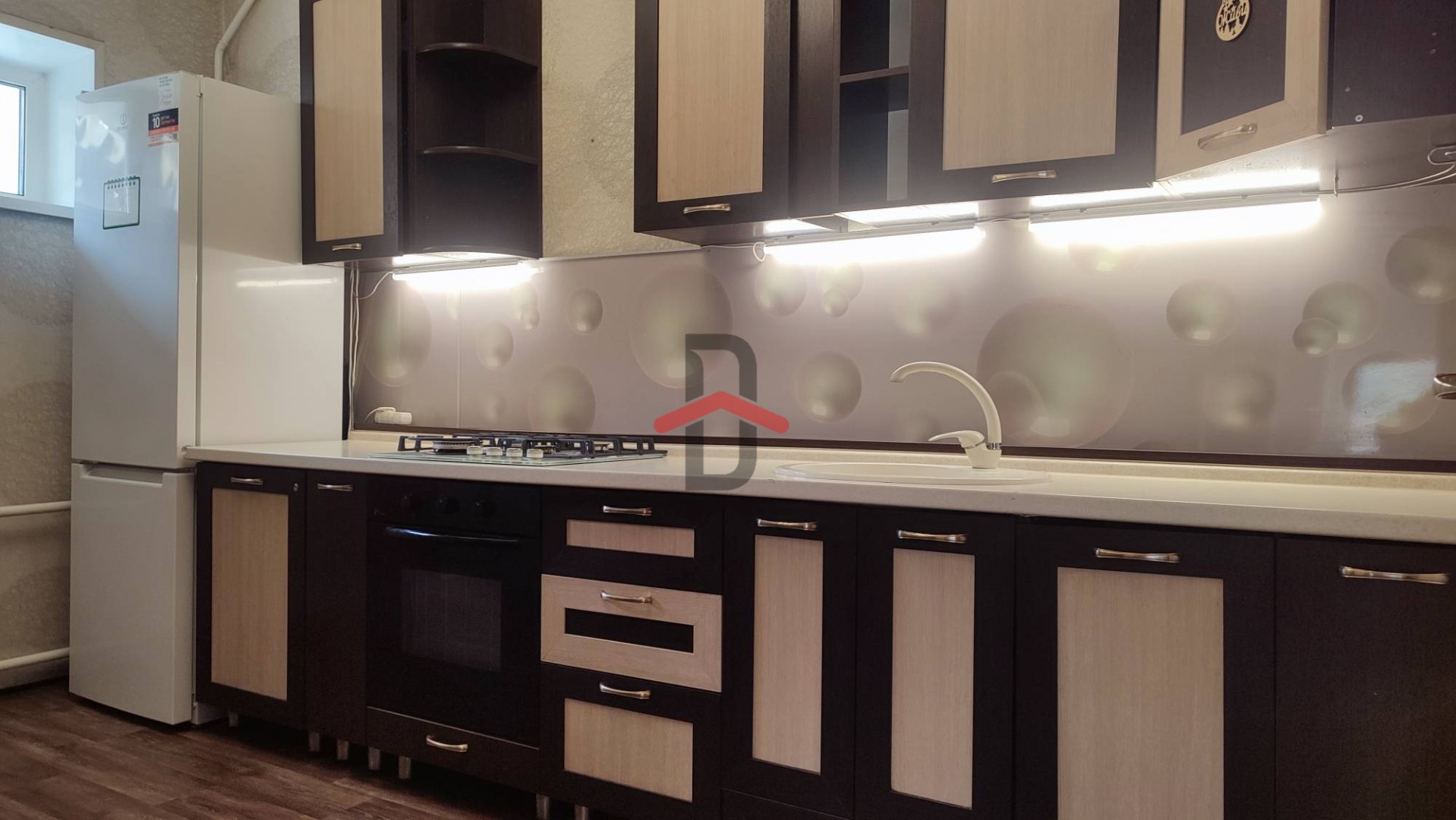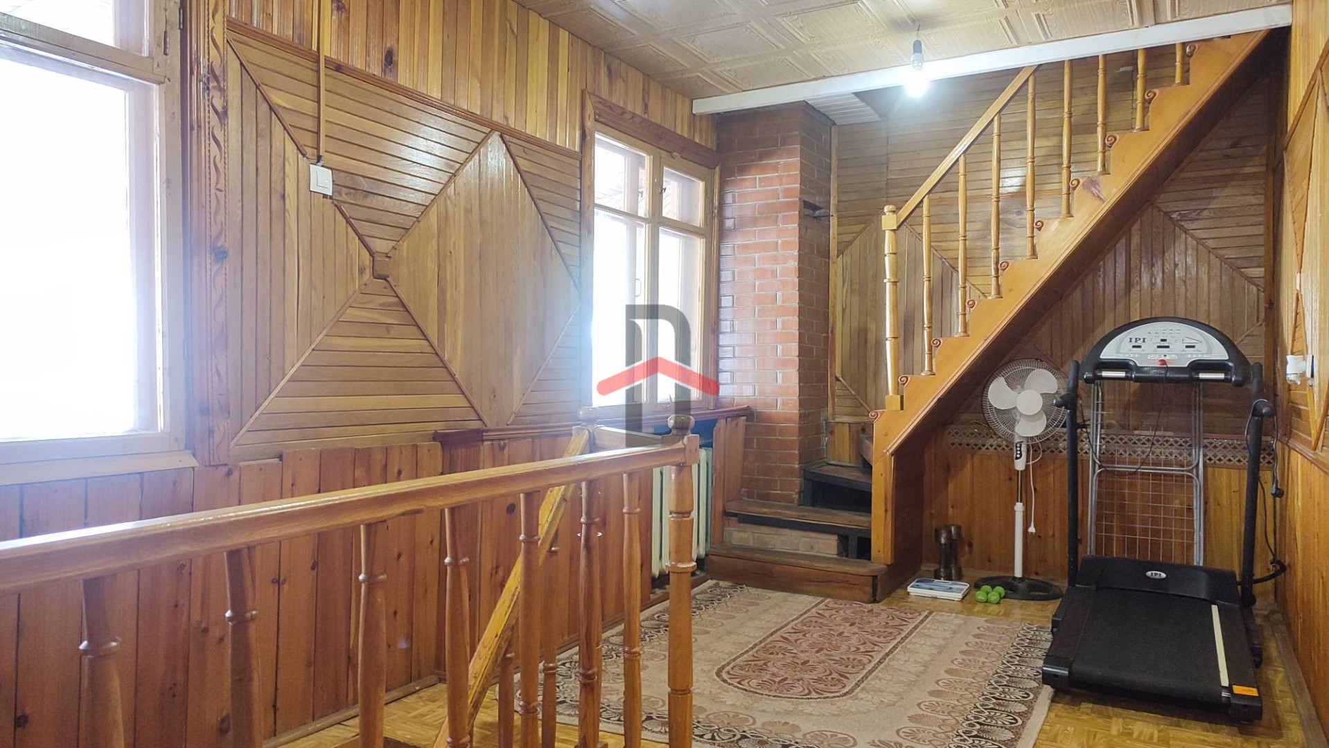На первом этаже находится гостиная (21,5кв.м.) с настоящим камином из кирпича, кухня, большая прихожая и сан.узел.