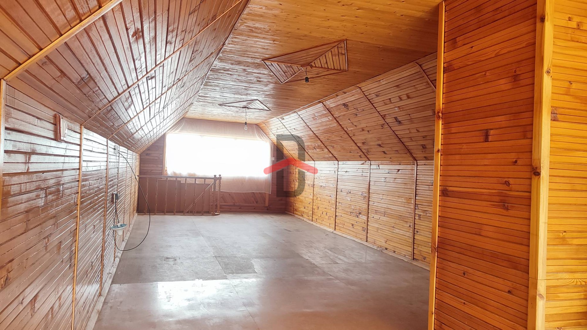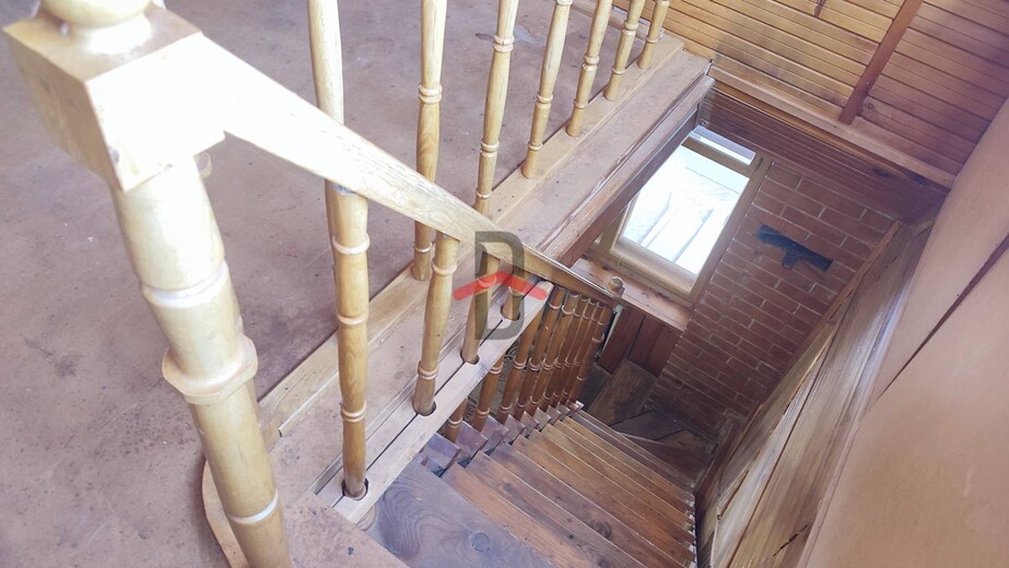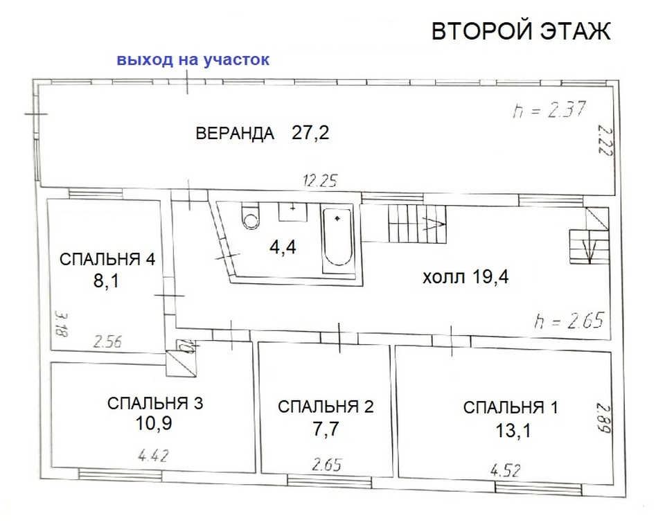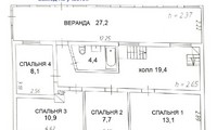 На втором: 4 спальни (площадь 13,1/10,9/8,1/7,7кв.м.), сан.узел с ванной, выход на большую веранду (27,2кв.м.) и лестница на мансардный этаж.