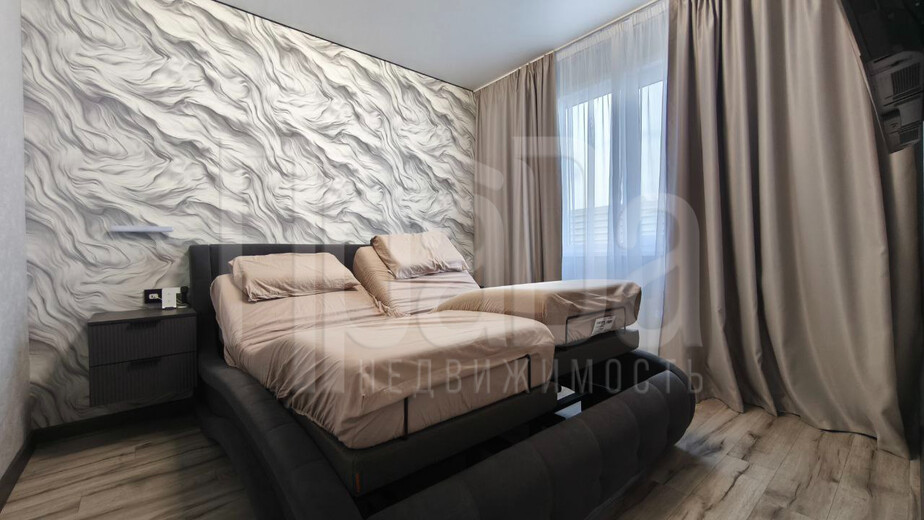 • Спальня: спокойствие в деталях. Две подвесные тумбы, трёхрежимные диодные светильники, многорежимная люстра на Алисе. Кровать Ormatek с двумя независимыми смарт-основаниями и матрасами — подсветка, массаж головы и ног, антихрап, «невесомость» и любое положение — всё по отдельному пульту на каждую половину. На стене — Яндекс ТВ 40" для тихих вечеров.