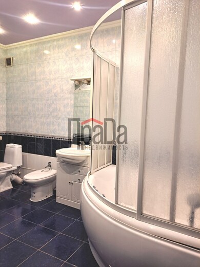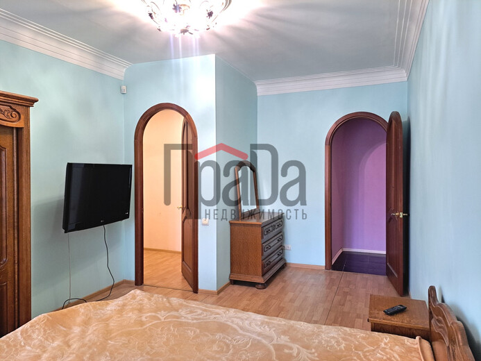 - просторная мастер-спальня: собственный санузел (унитаз, биде, джакузи), гардеробная, шкаф плательный, кровать двуспальная, прикроватные тумбы, комод, телевизор.