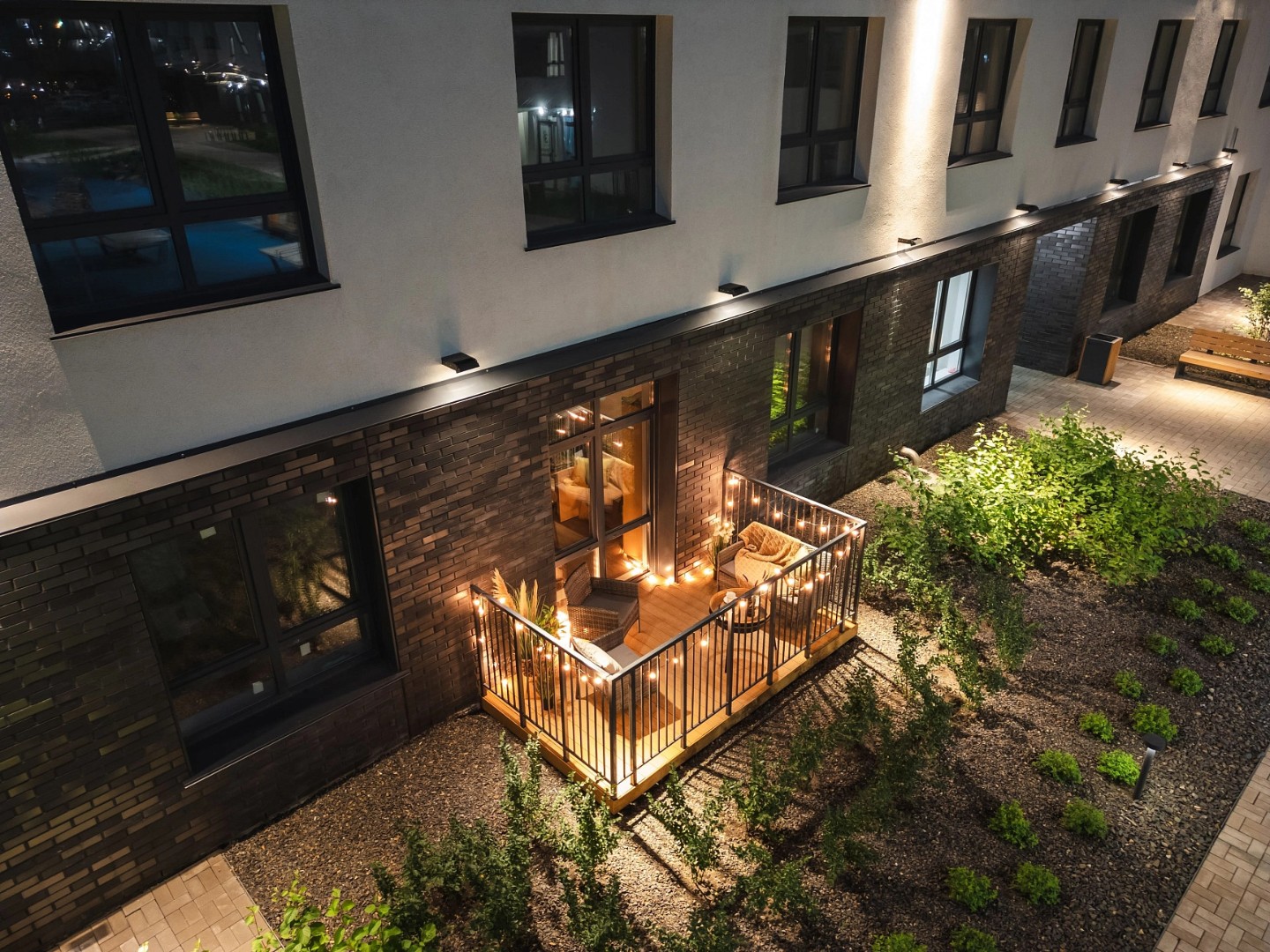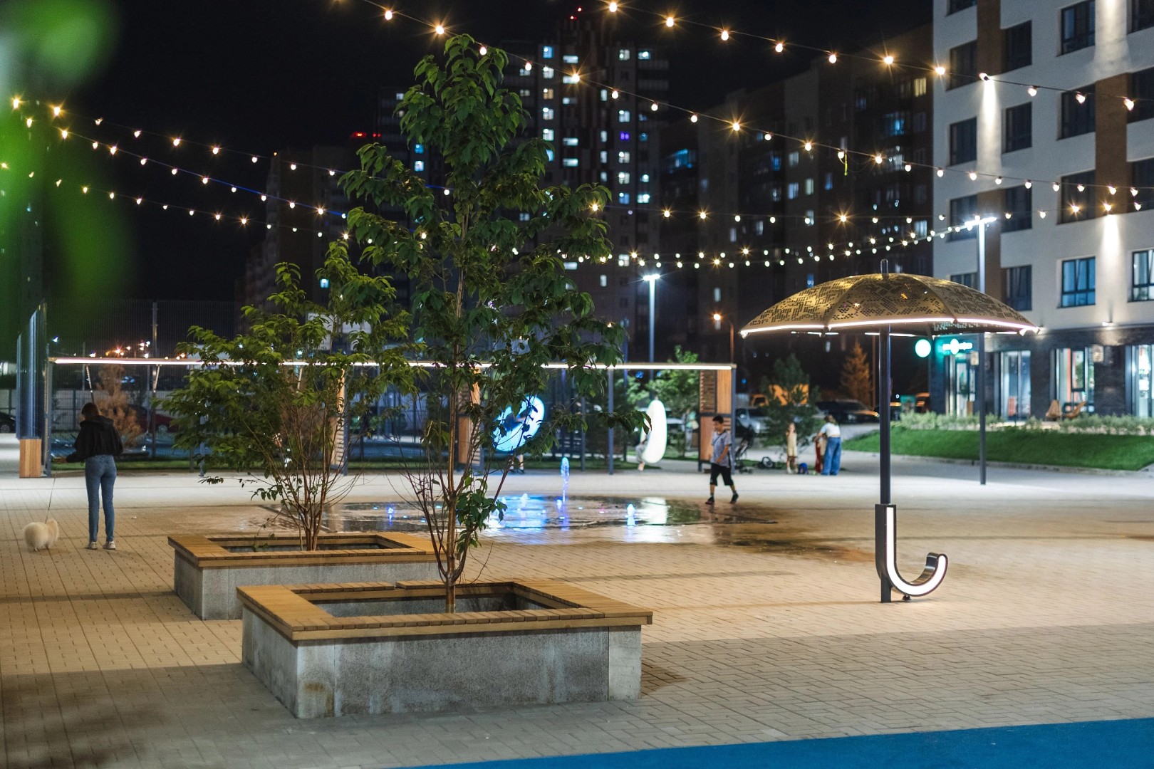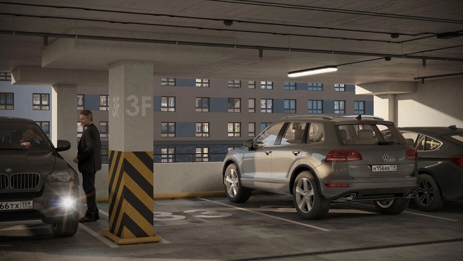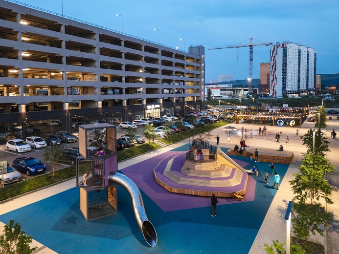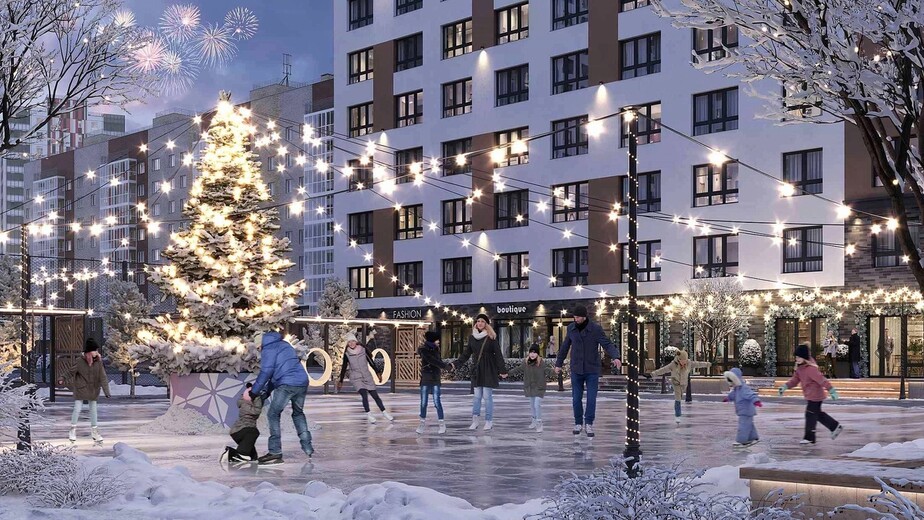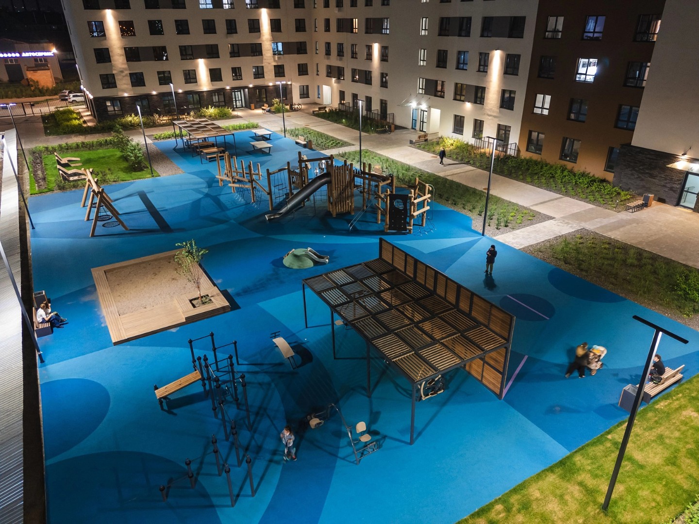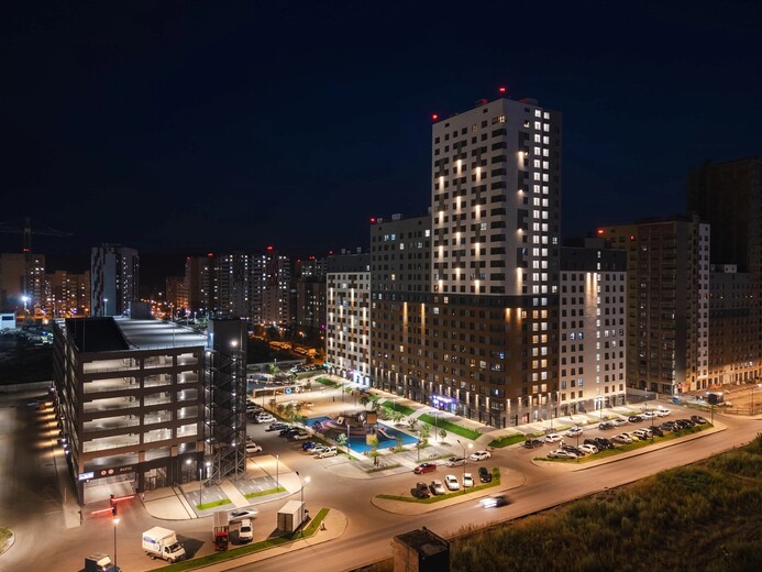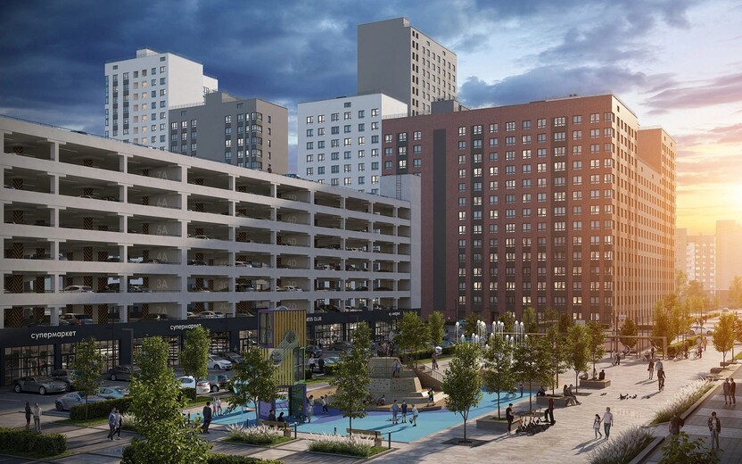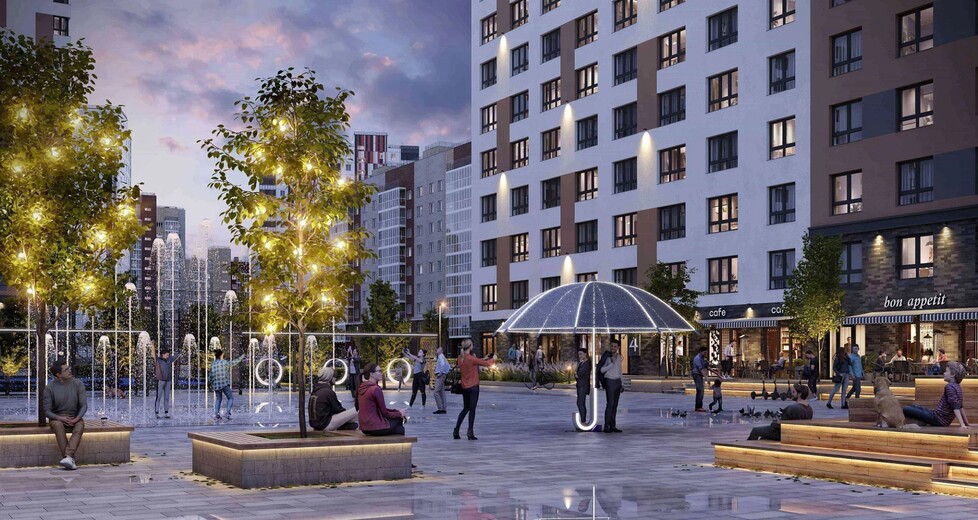 На первых этажах расположены помещения стрит-ритейла и заведения сферы услуг. Для машин за периметром квартала устроены наземные парковки и крытый семиэтажный паркинг. Игровые площадки на искусственных холмах, светящиеся качели, большая воркаут-зона и уличная мебель в тени деревьев.