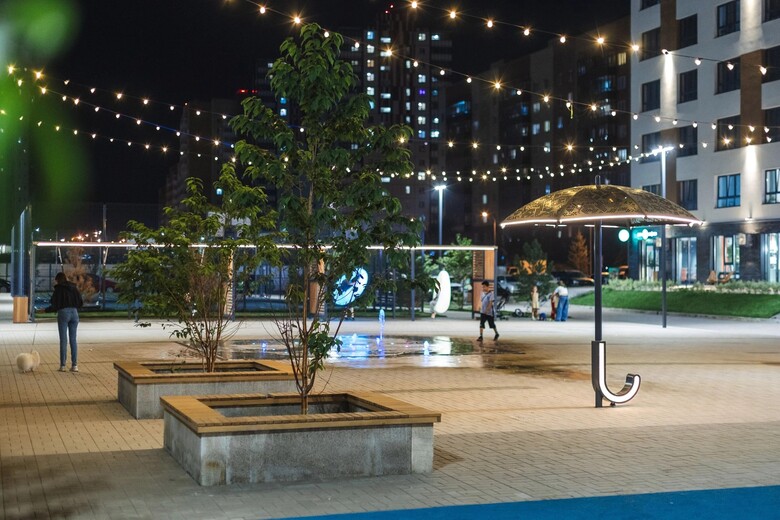 Прогулочная аллея проходит через все кварталы «Перемен» и заканчивается на площади с фонтаном – это главное место для отдыха и общения. Растения и элементы благоустройства пешеходных зон подобрали ландшафтные дизайнеры.